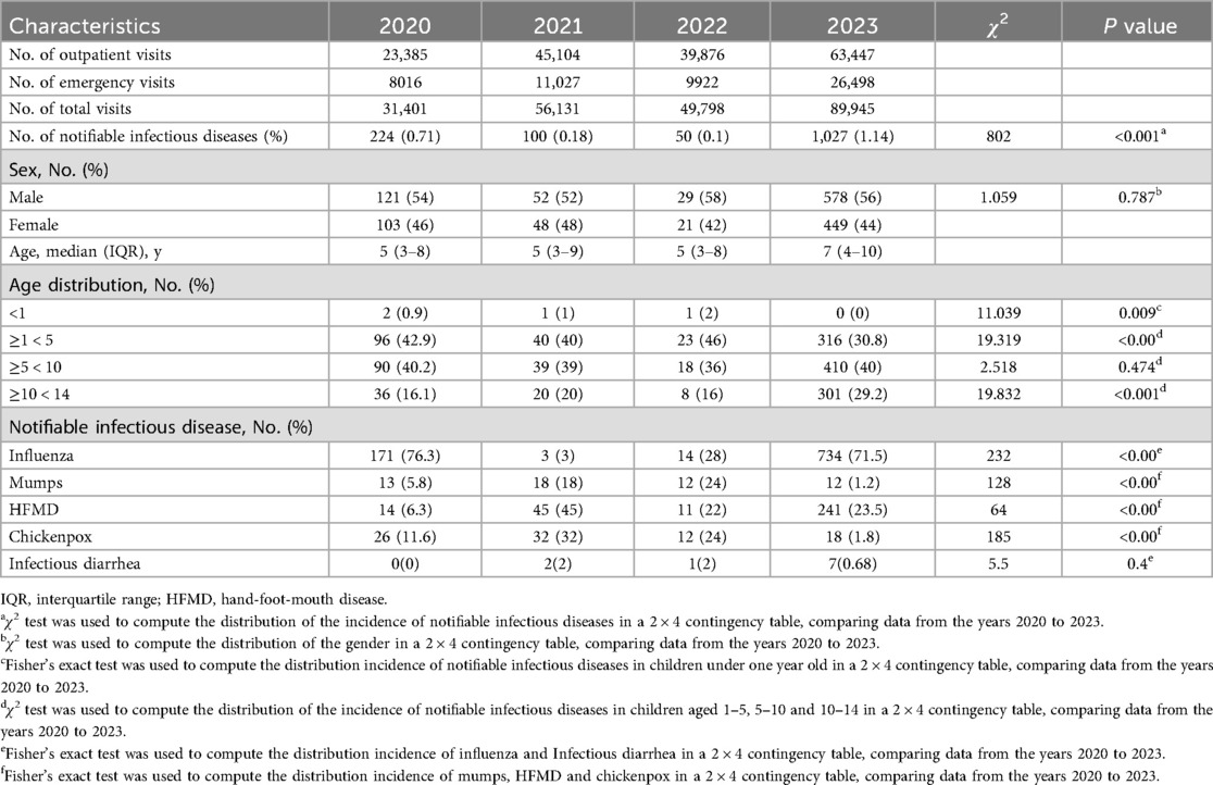 The proportion of notifiable infectious diseases was the absolute number of cases divided by the total number of visits. Age was represented as median values and 25% and 75% quartiles. We employ the chi-square test or Fisher's exact test to analyze the differences in gender, age group, and infectious disease incidence subgroups across various years. Statistical significance was defined as a two-tailed P < 0.05. All analyses were performed with SPSS Statistics for Windows version 25.0 (IBM).