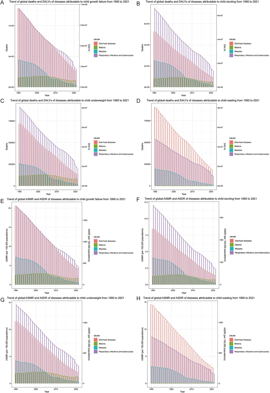 Figure 1. Trend of common infectious diseases in children with growth failure from 1990 to 2019. (A) Trend of global deaths and DALYs of diseases attributable to child growth failure. (B) Trend of global deaths and DALYs of diseases attributable to child stunting. (C) Trend of global deaths and DALYs of diseases attributable to child underweight. (D) Trend of global deaths and DALYs of diseases attributable to child wasting. (E) Trend of global ASMR and ASDR of diseases attributable to child growth failure. (F) Trend of global ASMR and ASDR of diseases attributable to child stunting. (G) Trend of global ASMR and ASDR of diseases attributable to child underweight. (H) Trend of global ASMR and ASDR of diseases attributable to child wasting.