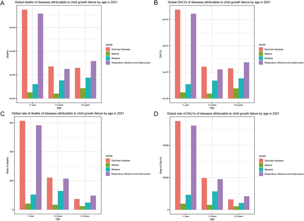 Figure 2. Age-specific incidence of common infectious diseases in children with growth failure in 2021. (A) Global deaths of diseases attributable to child growth failure by age in 2021. (B) Global DALYs of diseases attributable to child growth failure by age in 2021. (C) Global rate of deaths of diseases attributable to child growth failure by age in 2021. (D) Global rate of DALYs of diseases attributable to child growth failure by age in 2021.