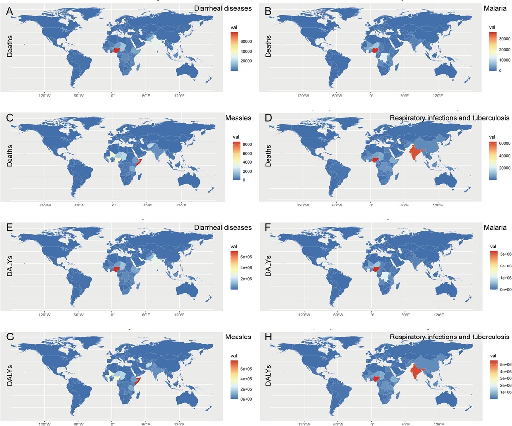 Figure 3. World map of deaths and DALYs of common infectious diseases in children with growth failure in 2021. (A) Global deaths map of diarrheal diseases attributable to child growth failure in 2021. (B) Global deaths map of malaria attributable to child growth failure in 2021. (C) Global deaths map of measles attributable to child growth failure in 2021. (D) Global map of respiratory infections and tuberculosis attributable to child growth failure in 2021. (E) Global deaths and DALYs map of diarrheal diseases attributable to child growth failure in 2021. (F) Global DALYs map of malaria attributable to child growth failure in 2021. (G) Global DALYs map of measles attributable to child growth failure in 2021. (H) Global DALYs map of respiratory infections and tuberculosis attributable to child growth failure in 2021.