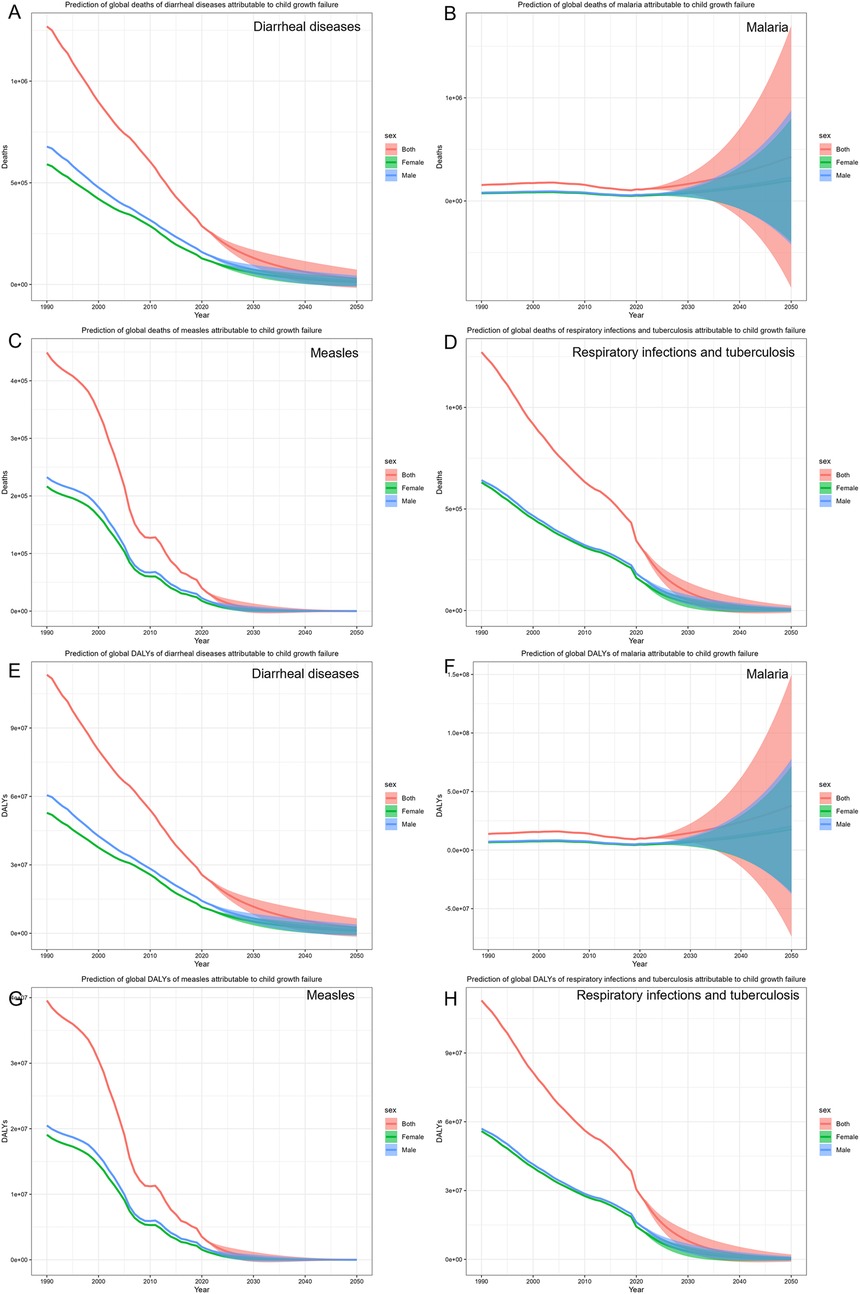 Figure 4. The prediction of common infectious diseases in children with growth failure. (A) Prediction of global deaths of diarrheal diseases attributable to child growth failure. (B) Prediction of global deaths of malaria attributable to child growth failure. (C) Prediction of global deaths of measles attributable to child growth failure. (D) Prediction of global deaths of respiratory infections and tuberculosis attributable to child growth failure. (E) Prediction of global DALYs of diarrheal diseases attributable to child growth failure. (F) Prediction of global DALYs of malaria attributable to child growth failure. (G) Prediction of global DALYs of measles attributable to child growth failure. (H) Prediction of global DALYs of respiratory infections and tuberculosis attributable to child growth failure.