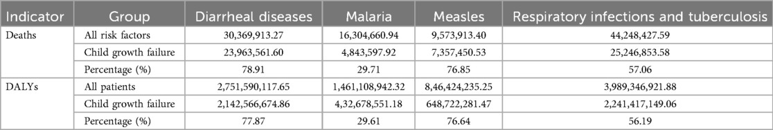 Table 1. The total deaths and DALYs of global children under 5 years old with child growth failure with common infectious diseases (diarrheal diseases, malaria, measles, and respiratory infections and tuberculosis) from 1990 to 2021.