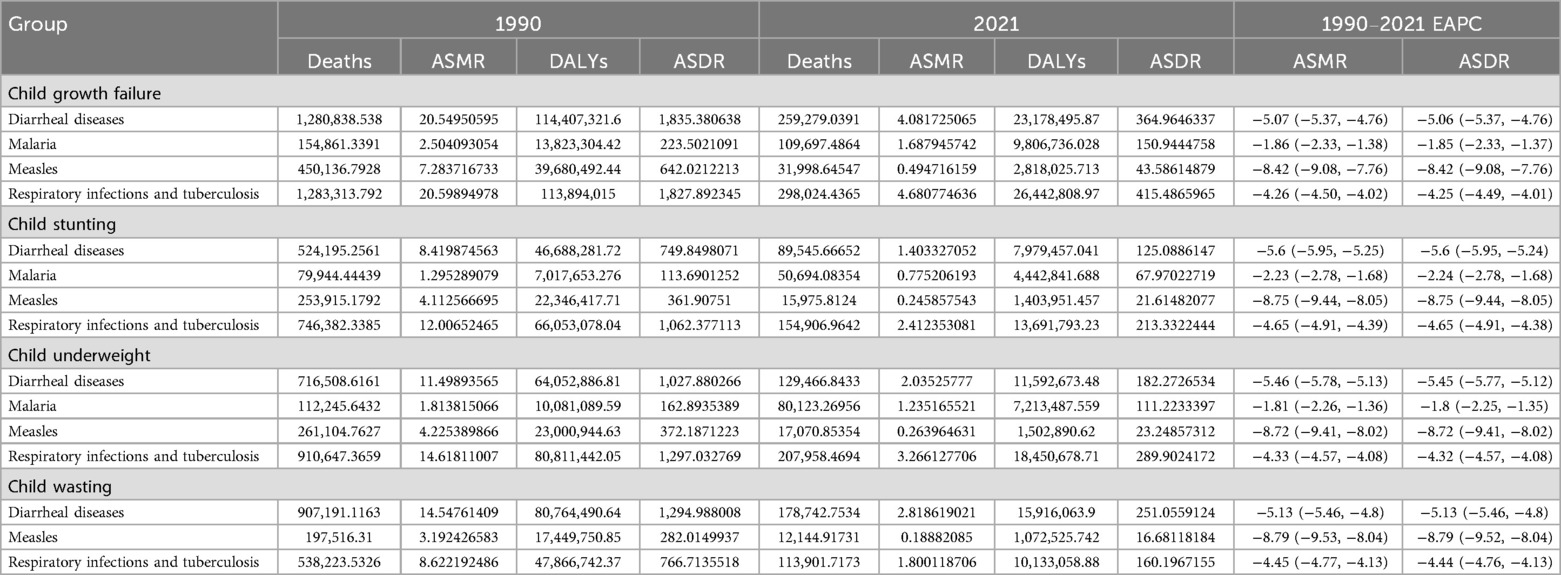 Table 2. Deaths, DALYs, ASMR, ASDR, and EAPC of global children under 5 years old with child growth failure with common infectious diseases (diarrheal diseases, malaria, measles, and respiratory infections and tuberculosis) from 1990 to 2021.