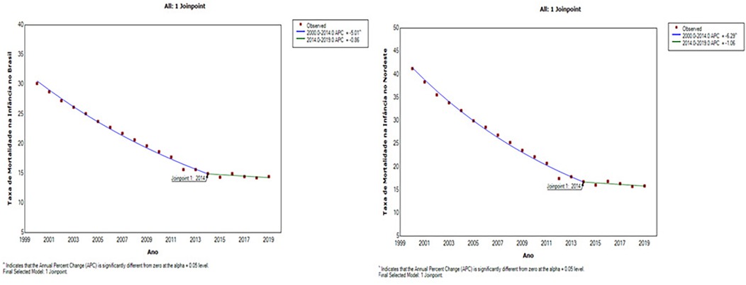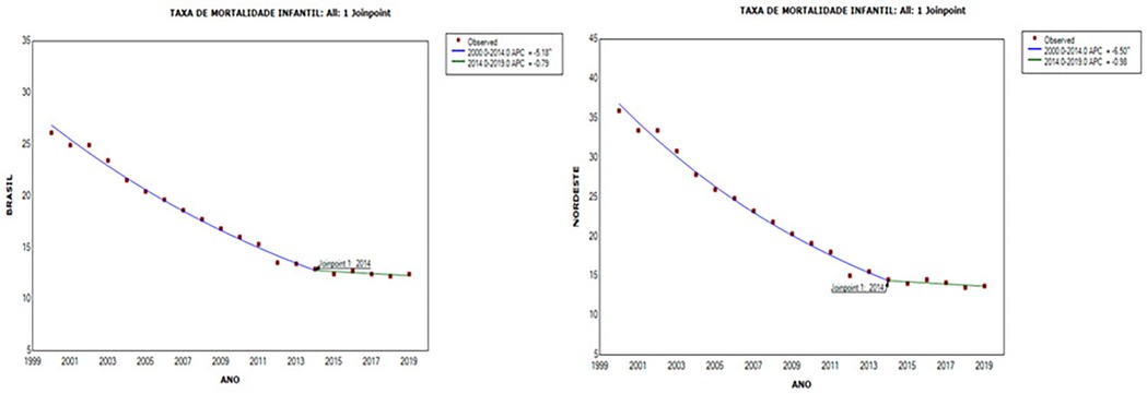 Figure 1 shows a statistically significant downward trend in the IMR in Brazil and the Northeast, respectively, APC = −5.2 (95%CI: −5.5; −4.9) and APC = −6.50 (95%CI: −6.9 and −6.1), in the period between 2000 and 2014, with a joinpoint in 2014, when the mortality coefficients began to show stability, with no statistically significant variations until 2019.