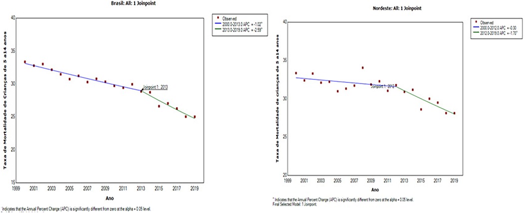 For the mortality rate among children aged 5–14, there was statistical significance both before and after the inflection point. In the Northeast, there was a greater reduction in the APC after this point. The slower reduction in the rate may be due to the lower risk of preventable causes of death typical of the childhood period. This reinforces the need to broaden approaches to this group, including traditional health determinants.
