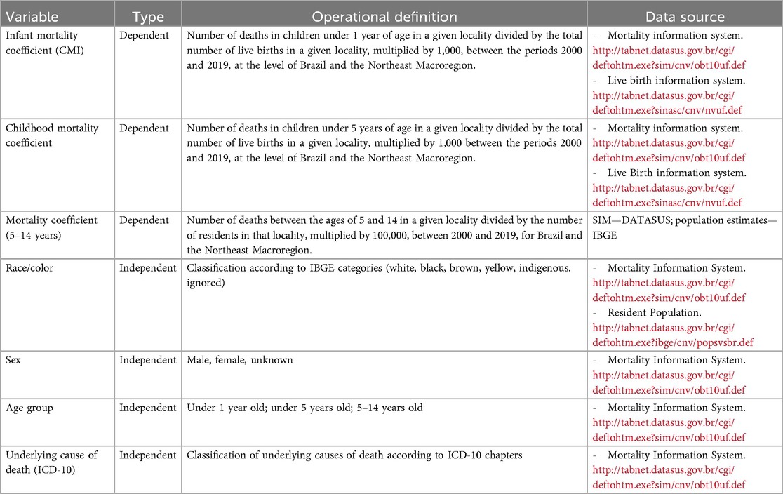 The dependent variables were: Infant Mortality Coefficients (under 1 year), Child Mortality Coefficient (under 5 years) and the Mortality Coefficient for children aged 5–14 years. The independent variables were race/color, gender and age group, with data expressed in absolute and relative values. The initial calculations were carried out using Microsoft Excel 2013 software. Details of the variables and data sources are shown in Table 1.