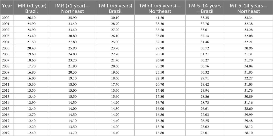 Even with the implementation of public policies, mortality rates among children in different age groups are still considerably higher when compared to developed countries (5). According to the Inter-Agency Group for Child Mortality Estimation (UN IGME), in 2022, Brazil had an IMR of 2.53 per thousand LB, an IMRf of 14.02 per thousand LB, and a mortality rate for children aged 5–14 of 2.33 per thousand 5-year-olds. In comparison, in Canada, the IMR was 4.34 per thousand LB; the IMRf was 4.94 per thousand LB; and the mortality rate for children aged 5–14 was 0.88 per thousand 5-year-olds; in Norway, the IMR was 1.76 per thousand LB; the IMRf was 2.17 per thousand LB; the mortality rate for children aged 5–14 was 0.67 per thousand children aged 5; and in Japan, the IMR was 1.72 per thousand LB; the IMRin was 2.28 per thousand LB and the mortality rate for children aged 5–14 was 0.72 per thousand children aged 5, revealing significant disparities (6).
