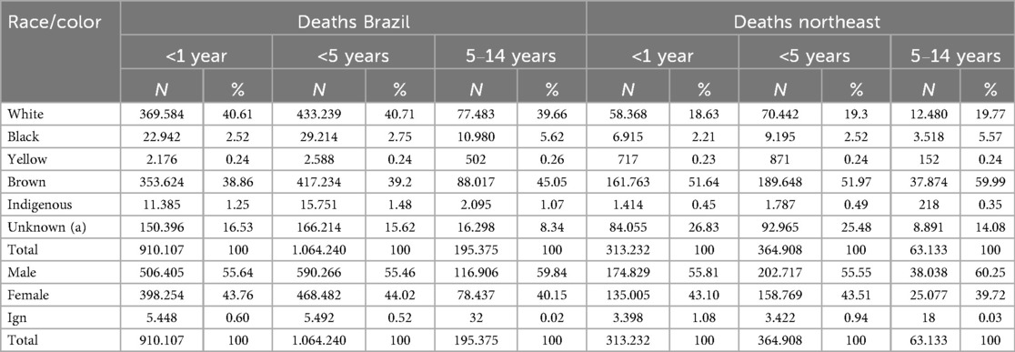 In children aged 5–14, although the absolute number was lower in both Brazil and the Northeast, there was a change in the racial profile of deaths. In Brazil, brown children accounted for the majority of deaths in this age group, 37,874 (59.99%), followed by white children, 12,480 (19.77%). When the deaths of brown and black children are added together, the percentage of fatalities reaches 50.67% (N = 98,997) in Brazil and 65.56% (N = 41,392) in the Northeast.