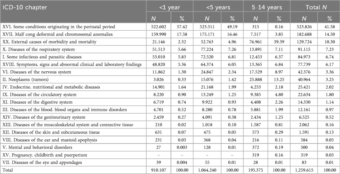 External causes of morbidity and mortality (Chapter XX) appear as the third leading cause of death in children aged 0–14. In Brazil, 129,724 deaths were recorded, of which (N = 76,961; 39.39%) occurred among children aged 5–14. In the Northeast, this proportion was even higher in this age group, with 24,040 deaths (38.08%) out of a total of 37,523. This data shows that external causes are more relevant at older ages.