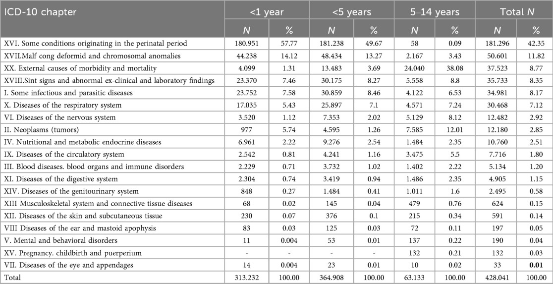 The analysis of child deaths, according to ICD-10 chapters, in Brazil and the Northeast Macroregion, between 2000 and 2019, shows that conditions originating in the perinatal period (Chapter VI) were the leading cause of mortality in children. In Brazil, this condition was responsible for 523,826 deaths, almost all of which occurred in children under the age of 1 (N = 522,602; 57.42%). In the Northeast Macroregion, this pattern continued, with 181,296 deaths, also concentrated in children under 1 year old. This cause alone accounts for almost half of child deaths in both locations.