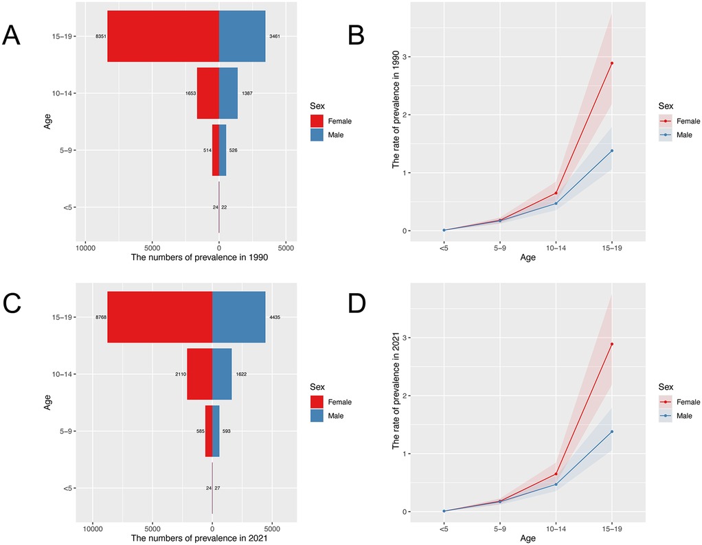 Four-panel data visualization comparing prevalence numbers and rates by age and sex in 1990 and 2021. Panels A and C show bar charts of prevalence numbers for 1990 and 2021, respectively, with red for females and blue for males. Panels B and D show line graphs of prevalence rates for 1990 and 2021, respectively, with red lines indicating females and blue lines indicating males. Both prevalence numbers and rates are higher in the age group fifteen to nineteen in each year, with notable increases from 1990 to 2021.