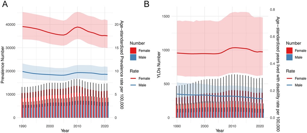 Two-panel graph depicting trends from 1990 to 2020. Panel A shows prevalence numbers and age-standardized prevalence rates for females (red) and males (blue). Red and blue shaded areas indicate data variability. Panel B displays YLDs numbers and age-standardized YLDs rates, with similar color coding and shading. Black error bars illustrate uncertainties. Both panels show general trends over time, highlighting gender differences.