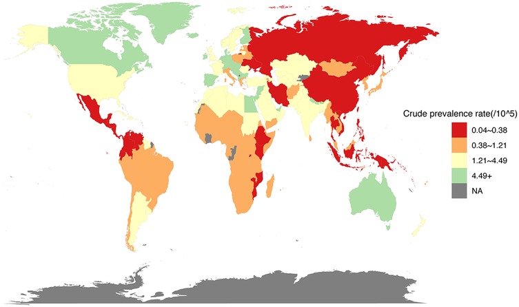 World map showing crude prevalence rates per 100,000 people. Countries in red have the highest rates (0.04 to 0.38), orange indicates 0.38 to 1.21, yellow shows 1.21 to 4.49, and green indicates 4.49+. Gray areas are not available.