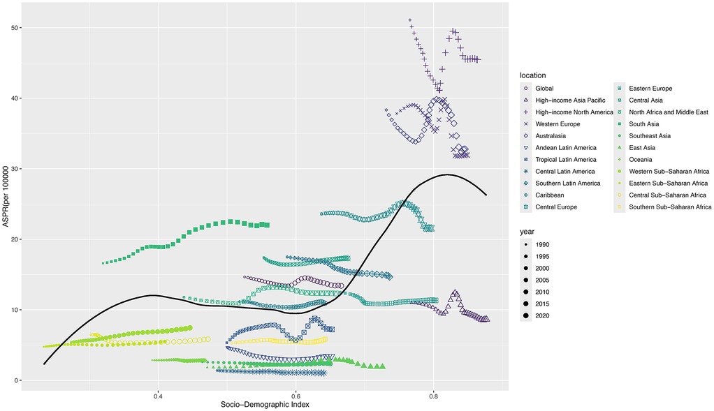 The trend of ASPR significantly decreased from 1990 to 2021 [AAPC = −0.29 (95% CI: −0.34, −0.24)] in both sexes. Interestingly, females [AAPC = −0.35 (95% CI: −0.42, −0.28)] had lower AAPCs for ASPR than males [AAPC = −0.20 (95% CI: −0.22, −0.17)], as shown in Supplementary Table S2.