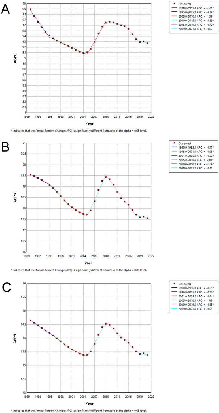 Three line graphs labeled A, B, and C show ASPR trends from 1989 to 2022. Each graph displays observed data with annual percent change (APC) segments. Significant APC values are marked with an asterisk. Graph A ranges from 8.1 to 10, B from 16 to 21, and C from 12 to 16 on the ASPR scale. Legends indicate periods and corresponding APC values. The y-axis is labeled ASPR and the x-axis is labeled Year.