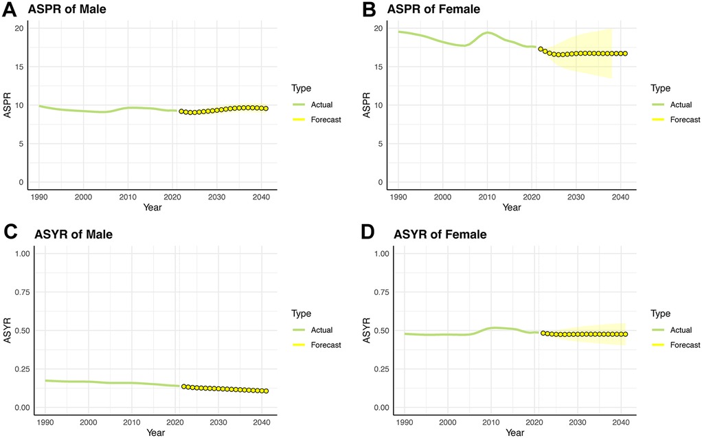 Four line graphs representing ASPR and ASYR for males and females from 1990 to 2040. Graph A shows male ASPR with a stable trend and forecasting starting around 2020. Graph B shows female ASPR with a slight decline. Graph C displays male ASYR decreasing, while Graph D shows female ASYR maintaining a steady trend. Actual data is in light green, and forecast data is indicated with yellow circles.