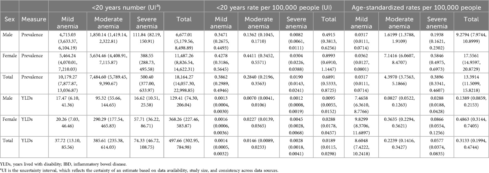 Table 1 also shows the YLDs numbers and ASYRs of IBD-associated anemia for children and adolescents in 2021. YLDs numbers of moderate anemia caused by IBD were both highest in females (290.29, 95% UI = 177.54, 465.83) and males (95.32, 95% UI = 55.66, 144.65). However, ASYRs showed diverse trends by sex, suggesting higher YLD rates of mild anemia.