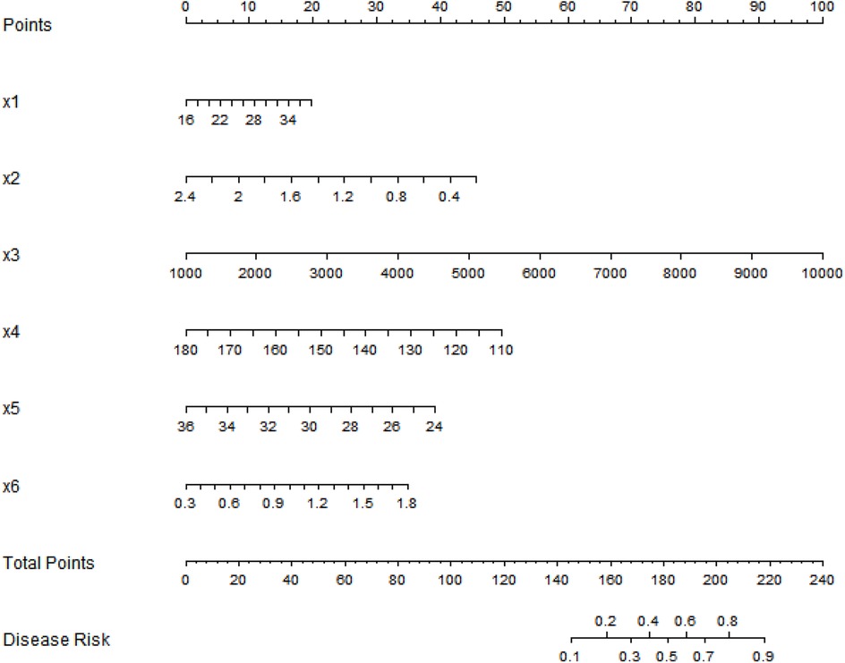Graph depicting a scoring system for calculating disease risk. It includes scales labeled x1 through x6 for different variables, with corresponding points ranging from zero to one hundred. The total points scale goes from zero to 240, predicting disease risk between 0.1 and 0.9.