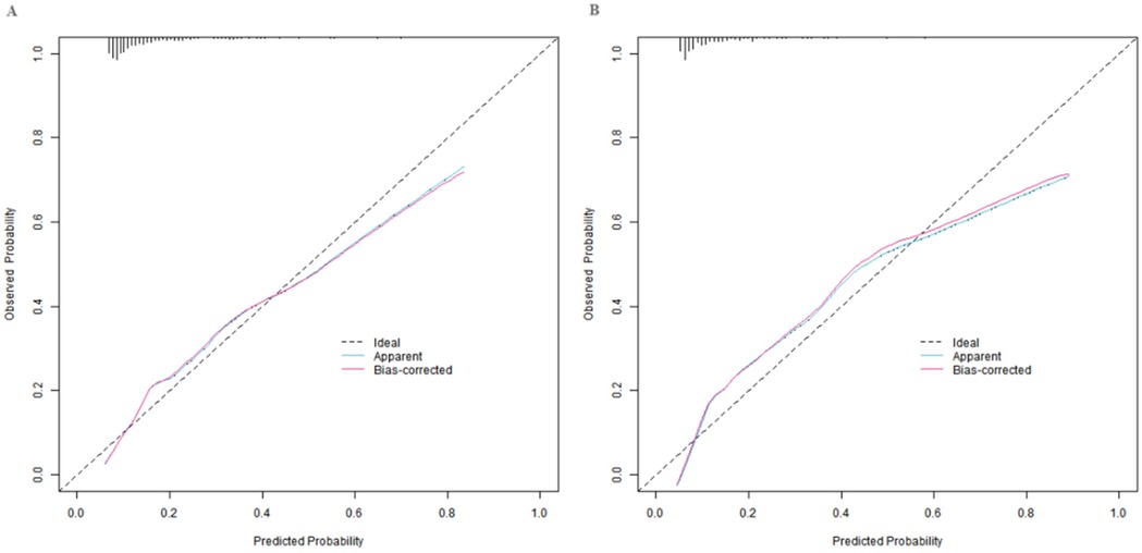Calibration plots A and B show predicted vs. observed probabilities. Both plots include dashed lines for ideal calibration, with blue lines for apparent and pink lines for bias-corrected calibration. Predicted probabilities range from 0 to 1 on the x-axis, and observed probabilities range from 0 to 1 on the y-axis. Both plots depict slight deviation from the ideal line.