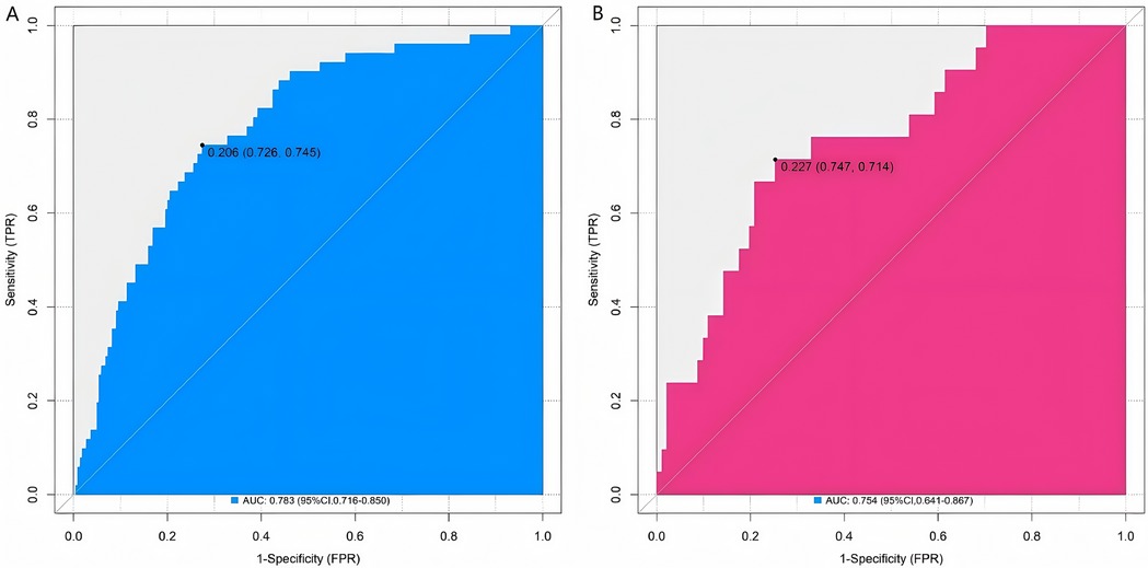 Figure 3. ROC curves in the training set (A) and the validation set (B).