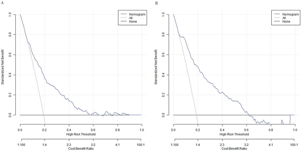 Two decision curve analysis graphs labeled A and B compare standardized net benefits across high-risk thresholds. Both graphs have three lines representing a nomogram, all, and none. The x-axes represent high-risk thresholds and cost-benefit ratios, and the y-axes represent standardized net benefit. The nomogram line decreases as the threshold increases in both graphs, while the all and none lines remain mostly linear.
