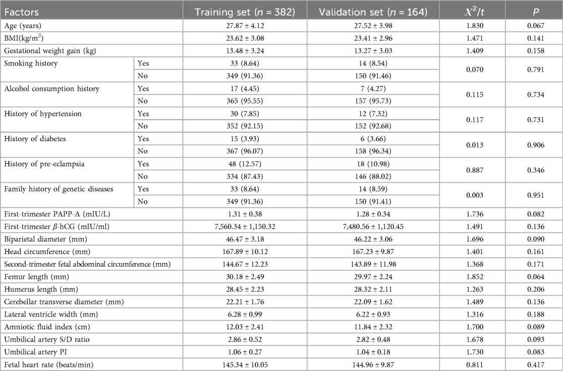 A total of 546 pregnant women (training set: n = 382; validation set: n = 164) were included in this study. There were no statistically significant differences in general clinical characteristics, such as age, height, BMI, smoking history, drinking history, history of hypertension, history of diabetes, family genetic history, first-trimester PAPP-A level, first-trimester β-hCG level, and various second-trimester fetal ultrasound indicators, as well as most laboratory indicators between the two sets (all P > 0.05) (Table 1).