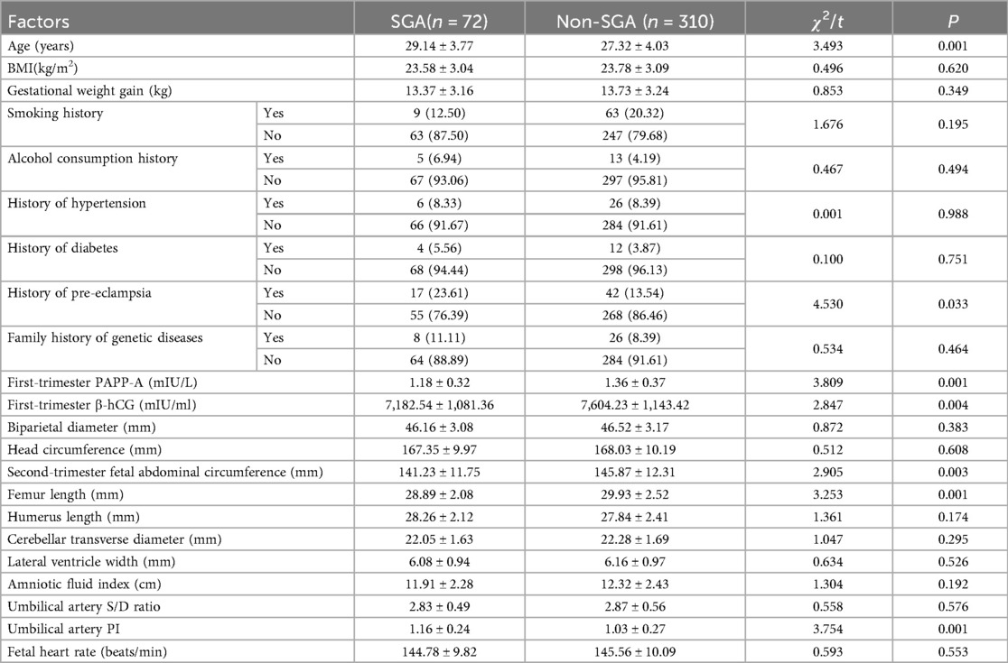 Small for gestational age (SGA) refers to newborns whose birth weight is below the 10th percentile of the weight of fetuses of the same gestational age and gender (1). SGA is not only closely associated with perinatal adverse outcomes, such as neonatal asphyxia, hypoglycemia, polycythemia, etc., but may also increase the risk of developing chronic diseases such as cardiovascular diseases and metabolic syndrome in adulthood (2). Globally, the incidence of SGA ranges from 5% to 15%, and in China, epidemiological data show it is approximately 8%–12%, accounting for a significant proportion of perinatal adverse events. Clinically, SGA infants have a 3–5-fold higher risk of neonatal asphyxia, hypoglycemia, and polycythemia compared to appropriate-for-gestational-age infants; in the long term, they face a 1.5–2-fold increased risk of cardiovascular diseases (e.g., hypertension, coronary heart disease) and metabolic syndrome (e.g., type 2 diabetes) in adulthood. This substantial disease burden imposes heavy pressure on maternal and child health services and family care, underscoring the urgency of developing accurate SGA prediction tools (3). Accurately predicting SGA is of great significance for early intervention and improving the perinatal prognosis of mothers and infants. The maternal baseline characteristics of pregnant women, such as age, body mass index (BMI), underlying diseases, etc., have a significant impact on fetal growth and development (4). Pregnancy-associated plasma protein-A (PAPP-A) and β-human chorionic gonadotropin (β-hCG) in the first trimester of pregnancy are key markers secreted by the placenta, and changes in their levels can reflect placental function and the fetal growth environment (5). Fetal ultrasound indicators in the second trimester of pregnancy can intuitively and dynamically evaluate the status of fetal growth and development (6). In clinical management, current SGA prediction often relies on single indicators (e.g., isolated second-trimester ultrasound or first-trimester serum markers), leading to low prediction accuracy. This delays timely interventions (e.g., nutritional guidance, close fetal monitoring) for high-risk pregnant women, increasing the risk of adversed perinatal outcomes. From a public health perspective, unrecognized SGA cases contribute to increased neonatal hospitalization rates and long-term chronic disease prevalence, elevating healthcare costs (7). A study in Arch Gynecol Obstet noted that regions with insufficient SGA screening tools had a 20% higher neonatal intensive care unit admission rate for SGA infants. These clinical and public health challenges confirm the need for a multi-dimensional integrated prediction model (8). However, at present, studies on constructing prediction models to evaluate the risk of SGA by combining these multi-dimensional indicators are still insufficient. The development of this model and nomogram was driven by two key needs: Firstly, existing SGA prediction models rarely integrate maternal baseline characteristics, first-trimester serum markers, and second-trimester ultrasound parameters simultaneously, resulting in incomplete capture of SGA-related risk factors and limited prediction performance. Secondly, nomograms offer unique advantages in clinical practice—they transform complex regression equations into intuitive visual tools. Clinicians can quickly calculate an individual's SGA risk by summing scores of each indicator (e.g., maternal age, PAPP-A level) without relying on professional statistical software. This improves the accessibility and efficiency of risk assessment, especially in primary healthcare institutions with limited technical resources. In contrast, traditional regression models require complex calculations, making them difficult to apply in routine clinical work. Thus, developing a multi-dimensional nomogram is essential to bridge the gap between research and clinical practice. This study aims to deeply analyze the internal relationships between each indicator and SGA, construct and validate a precise prediction model, provide a more effective prediction tool for clinical practice, and improve the level of perinatal care.