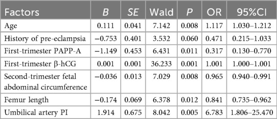 The occurrence of SGA was taken as the dependent variable (0 = Non-SGA, 1 = SGA), and the factors with P < 0.05 in the univariate analysis were used as covariates for further multivariate logistic regression analysis. The results showed that maternal age, first-trimester PAPP-A, first-trimester β-hCG, second-trimester fetal abdominal circumference, femoral length, and umbilical artery PI were independent risk factors for the occurrence of SGA (P < 0.05) (Table 3).