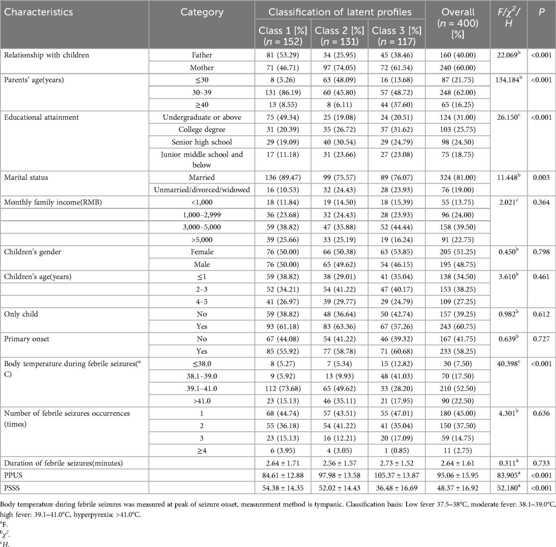 Results: In total, 400 participants were included in this study. The perceived vulnerability among parents of children with febrile seizures was divided into three latent profiles: “General Low Perceived Vulnerability Group” (37.9%), “Moderate Perceived Vulnerability Group” (32.8%), and “High Perceived Vulnerability Group” (29.3%). Multivariate analysis indicated that relationship with children, parents’ age, educational attainment, marital status, body temperature during febrile seizures, PPUS, and PSSS were the factors affecting perceived vulnerability in parents of children with febrile seizures.