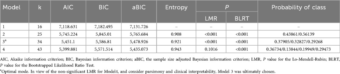 Profile classifications of perceived vulnerability for participants were identified using Mplus 8.0 software. The Pearson chi-square test, likelihood ratio chi-square test, Akaike information criterion (AIC), Bayesian information criterion (BIC), and sample size-adjusted BIC were utilized to examine the discrepancies between expected and observed values, thereby assessing the model's goodness-of-fit. Lower values indicate a superior match. The bootstrap likelihood ratio test (BLRT) and likelihood ratio test (Lo-Mendell-Rubin, LMR) were utilized to contrast the fit differences among various models. The closer the entropy value is to 1, the more accurate the classification.