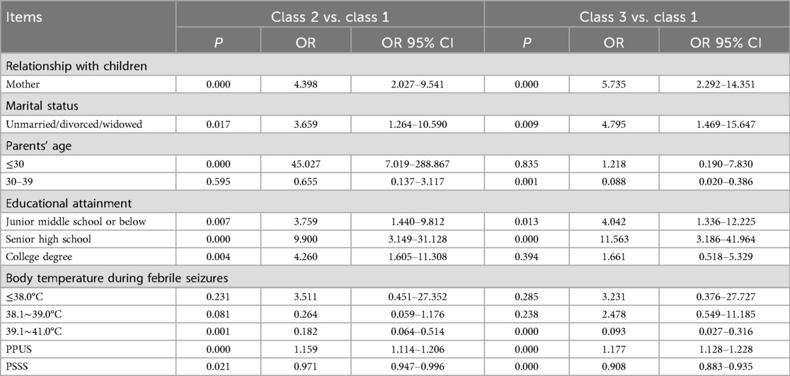 Compared with Class 1, mothers and marital status(single, divorced, or widowed), were more likely to be classified as Class 3. Meanwhile, higher PPUS and lower PSSS traits were more likely to be classified as Class 3. Compared with parents aged 40 and above, those aged 30–39 have a reduced risk of experiencing perceived vulnerability (OR = 0.088, 95% CI 0.020–0.386, P = 0.001). Individuals with an educational level of junior high school or below (OR = 4.042, 95% CI 1.336–12.225, P = 0.013) and high school (OR = 11.563, 95% CI 3.186–41.964, P = 0.000) had an increased risk of high-level perceived vulnerability. The probability of increased perceived vulnerability among parents with children's body temperature 39.0–41.0°C during FS was 0.093 times that of other age groups (OR = 0.093, 95% CI 0.027–0.316, P = 0.000). Compared with Class 1, Parents who are mothers, age (years) ≤30, marital status unmarried/divorced/widowed, lower educational attainment, body temperature 39.0–41.0°C during FS, higher PPUS, and lower PSSS were more likely to be classified as Class 2. The probability of increased perceived vulnerability among mothers was 4.398 times that of other groups (OR = 4.398, 95% CI 2.027–9.541, P = 0.000). The probability of increased perceived vulnerability among unmarried/divorced/widowed parents was 3.659 times that of other groups (OR = 3.659, 95% CI 1.264–10.590, P = 0.017). The probability of increased perceived vulnerability among parents aged ≤30 was 45.027 times that of other groups (OR = 45.027, 95% CI 7.019–288.867, P = 0.000). As the educational level decreases, the perceived vulnerability among parents tends to increase. A body temperature between 39.0 and 41.0°C significantly decreased the risk of perceived vulnerability (OR = 0.182, 95% CI 0.064–0.514, P = 0.001). The higher the score of PPUS, the higher the level of parents’ perceived vulnerability, which is statistically significant (OR = 1.159, 95% CI 1.114–1.206, P = 0.000). The lower the score of PSSS, the higher the level of parents’ perceived vulnerability, which is statistically significant (OR = 0.971, 95% CI 0.947–0.996, P = 0.021).