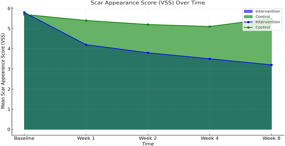 Scar quality, as assessed by the Vancouver Scar Scale (VSS), improved significantly in both groups over time. However, the comprehensive care group exhibited greater and more consistent improvements. At baseline, mean VSS scores were similar between groups (5.8 ± 0.9 in intervention vs. 5.7 ± 1.0 in observational cohort). By week 4, the comprehensive care group showed a marked reduction (mean score: 3.5 ± 0.6) compared to the observational cohort (5.1 ± 0.7). At the final 8-week evaluation, the mean VSS score in the comprehensive care group was significantly lower (3.2 ± 0.7) than observational group (5.5 ± 0.8), indicating a statistically significant improvement (p < 0.001) (Figure 1; Table 2).