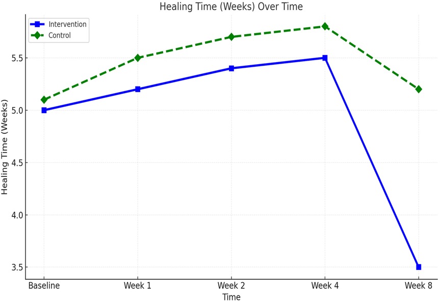 Wound healing progressed steadily in both groups, but significantly faster in the comprehensive care group. The average healing time was reduced from 5.0 weeks at baseline to 3.5 ± 0.6 weeks in the comprehensive care cohort, compared to 5.2 ± 0.7 weeks in the observational group. Week-by-week healing times are summarized in Table 3. The difference became statistically significant from week 2 onward and persisted through week 8 (p < 0.01). These trends are visualized in Figure 2 and further detailed by week 8 comparisons in Figure 3.