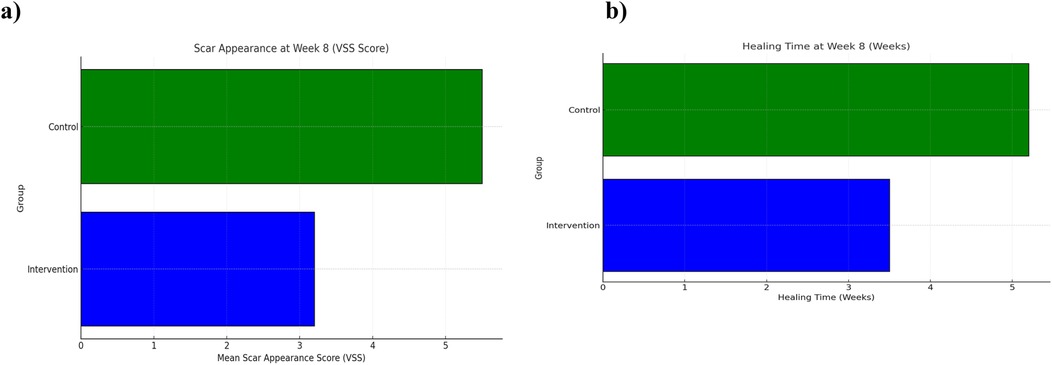 Figure 3. Scar appearance and healing time at week 8 between comprehensive care and observational cohorts. (a) Mean Vancouver Scar Scale (VSS) scores and (b) mean wound healing time (weeks) at Week 8 comparing the Comprehensive Care and Observational cohorts. Lower VSS scores and shorter healing times reflect improved outcomes.