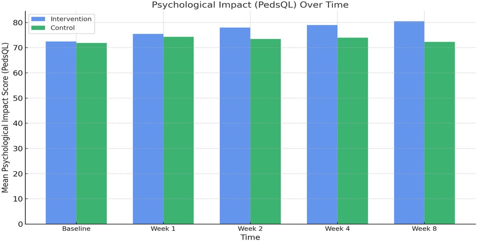 Psychological assessments using the Pediatric Quality of Life Inventory (PedsQL) showed consistent improvement in both groups. In the comprehensive care group, the mean PedsQL score improved from 72.5 ± 3.9 at baseline to 80.5 ± 4.2 at week 8. In contrast, the observational group saw a modest increase from 71.9 ± 4.0 to 72.3 ± 3.8. The between-group difference at week 8 was statistically significant (p < 0.001), indicating the efficacy of the psychological support component integrated into the nursing intervention (Figure 4; Table 2). Comparative analysis of PedsQL at week 8 is illustrated in Figure 5.