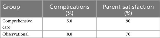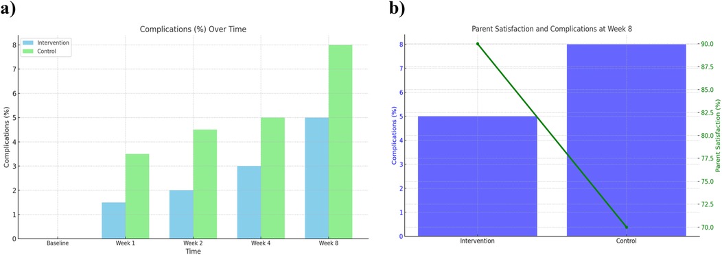 Parental satisfaction was assessed using a structured 5-point Likert scale. At week 8, 90% of parents in the comprehensive care group reported being “very satisfied” or “satisfied” with their child's recovery, compared to 70% in the observational group. Satisfaction scores are detailed in Table 2 and illustrated in Figure 3. Combined visualization of satisfaction and complications is shown in Figure 6.