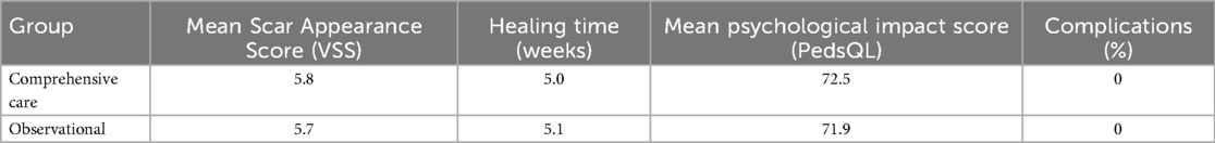 Results: The comprehensive care group were significantly higher VSS scores (3.2 ± 0.7 vs. 5.5 ± 0.8, p < 0.05), shorter healing time (3.5 ± 0.6 vs. 5.2 ± 0.7 weeks), higher PedsQL scores (80.5 ± 4.2 vs. 72.3 ± 3.8), lower complication rates (5.0% vs. 8.0%), and higher parental satisfaction (90% vs. 70%).