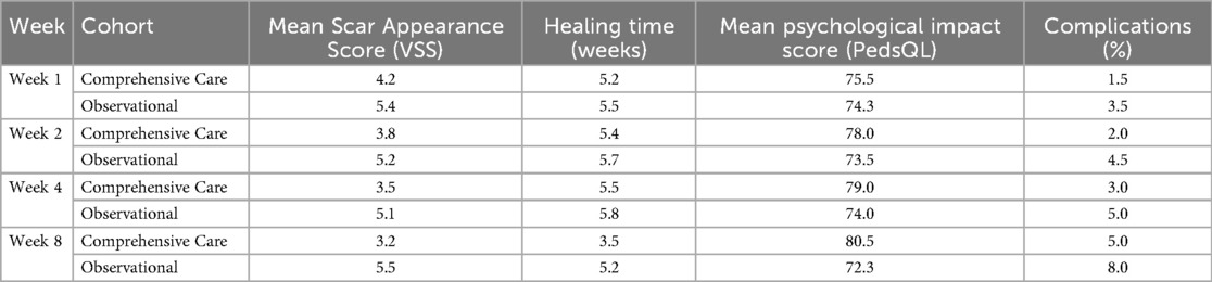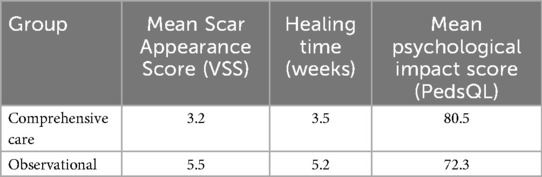 The psychological support program consisted of four structured sessions (initial, Week 1, Week 4, Week 8), each lasting approximately 20–30 min. Content included age-appropriate explanations of scarring, guided play therapy, relaxation and coping strategies, and caregiver education modules. Standardized scripts and visual aids were used to ensure consistency across sessions. Adverse reactions (child distress or caregiver burden) were monitored at each visit; no adverse psychological outcomes were reported during the study period (10, 19, 21). While PedsQL scores improved significantly, our study did not include qualitative interviews of children or caregivers; such data could provide richer insight into family dynamics, caregiver stress, and long-term psychosocial adaptation. Future studies should integrate mixed-methods approaches to capture these aspects.