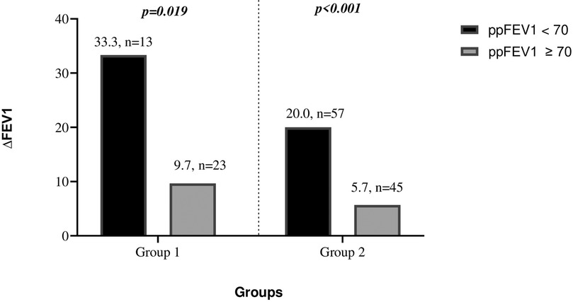 When stratified further by ppFEV₁ < 40% and ≥40%, the increase in ΔFEV₁ was not statistically significant in either Group 1 or Group 2 (p = 0.07; p = 0.44, respectively).