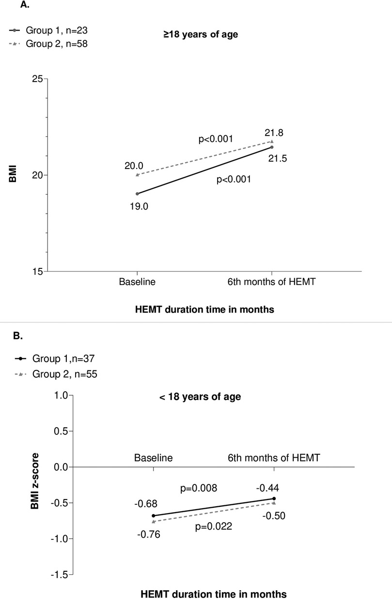 Figure 3. (A) BMI values in adults (≥18 years) over 6 months of HEMT in both groups. (B) BMI z-scores in children (<18 years) over 6 month of HEMT in both groups.