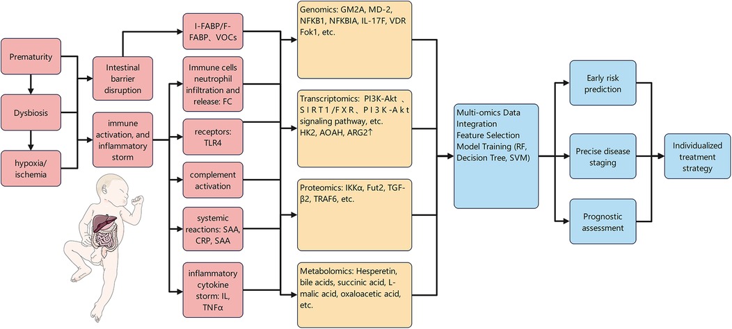 Multi-omics integration provides a powerful tool for deciphering the core driver pathways underlying the development and progression of necrotizing enterocolitis (NEC) by systematically uncovering interaction networks across distinct molecular layers, including the genome, transcriptome, proteome, and metabolome (162). For instance, two studies integrating transcriptomics and metabolomics revealed the synergistic mechanism of butyrate and Bacteroides fragilis in alleviating intestinal inflammation in NEC, laying a theoretical foundation for the development of novel therapeutic strategies (118, 119). Another study, by fusing DNA methylome and transcriptome data, identified widespread hypermethylation in NEC and characterized multiple key genes (e.g., ADAP1, GUCA2A) with suppressed expression due to increased methylation levels. Functionally, these genes are closely associated with intestinal inflammation and barrier integrity. This finding not only deepens the understanding of epigenetic regulatory mechanisms in NEC but also provides potential novel biomarkers for early diagnosis and risk prediction (163). Additionally, machine learning classification models constructed based on single-cell transcriptome and bulk transcriptome data have demonstrated excellent performance in cancer subtyping (164); such approaches are equally applicable to NEC research and are expected to enable precise patient stratification and prognostic assessment by integrating multi-omics information.