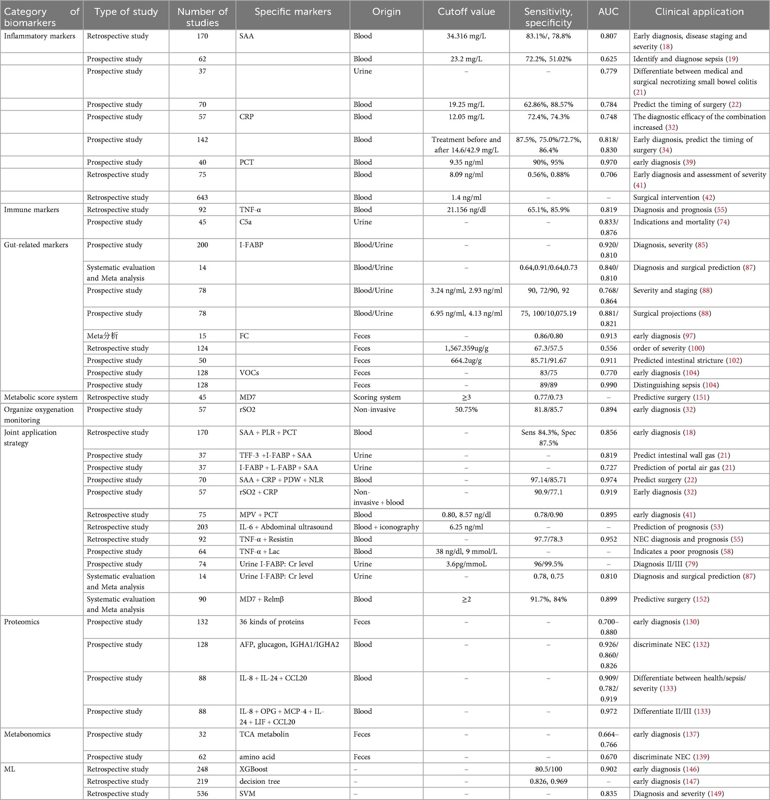 To systematically evaluate the diagnostic value of various biomarkers for NEC, this study summarizes the key indicators of their diagnostic efficacy based on existing literature, including sensitivity (Sens), specificity (Spec), and AUC. Additionally, an integrated perspective has been developed, as shown in Table 1 and Figure 1.