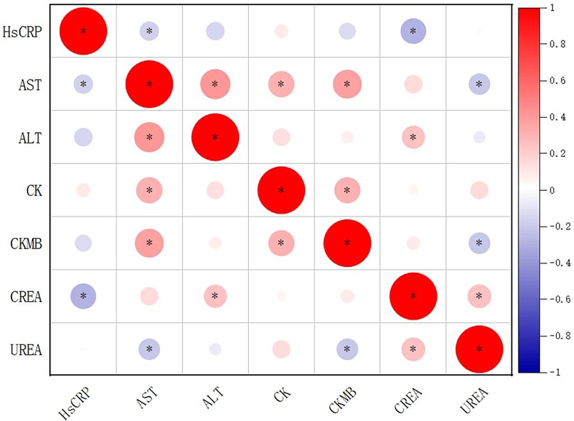 Figure 1. Correlation matrix of biochemical indicators in children with Mycoplasma pneumoniae pneumonia and coinfections. Circle size and color represent correlation strength and direction (red = positive; blue = negative). Asterisks (*) denote correlations significant at p < 0.05. Based on reported p-values, correlations between AST and ALT, AST and CK, AST and CK-MB, CK-MB and CK, and CK-MB and AST would remain significant after multiple-testing correction. Diagonal cells represent self-correlations (r = 1) and are retained for completeness, although they are mathematically trivial.