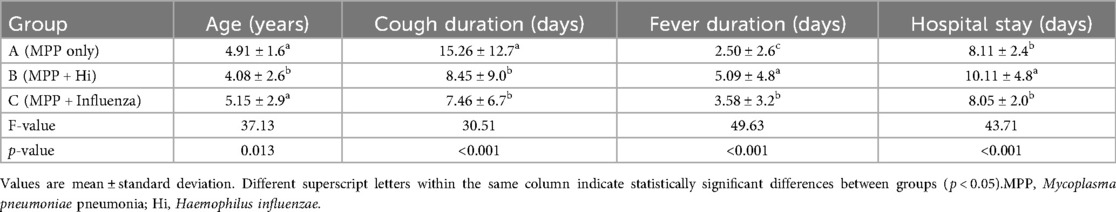 Table 1. Comparison of age, symptom duration, and hospital stay among children with Mycoplasma pneumoniae pneumonia, with and without coinfections (children with MPP + H. influenzae were youngest with longest fever and hospital stay; MPP-only had longest cough).