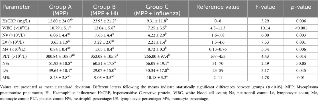 Mycoplasma pneumoniae pneumonia is increasingly reported alongside coinfections with Hi or influenza virus, which can worsen clinical outcomes in children due to their immature immunity and physiological vulnerability (3, 17). In this study, we compared the clinical and laboratory characteristics of children with MPP alone and those with coinfections involving Hi or influenza virus. We found that Hi coinfection was associated with elevated inflammatory markers, prolonged fever, and longer hospital stays, whereas influenza virus coinfection was characterized by lymphopenia and thrombocytopenia, reflecting differing host immune responses to bacterial vs. viral pathogens (18–20). These patterns are consistent with prior reports showing that Hi coinfection amplifies inflammatory responses through innate immune activation, resulting in higher hs-CRP and neutrophil counts (21–23), while influenza virus coinfection impairs host defences by inducing lymphocyte apoptosis and immune suppression (24). Clinically, the observed patterns suggest therapeutic implications. Children coinfected with Hi showed the highest hs-CRP, prolonged fever, and hospital stays, indicating a stronger inflammatory response that may warrant early antibacterial treatment. In contrast, MPP + influenza virus cases showed lymphopenia and thrombocytopenia, supporting timely antiviral use. Elevated CK-MB across all groups highlights the need for cardiac monitoring in pediatric MPP regardless of coinfection.