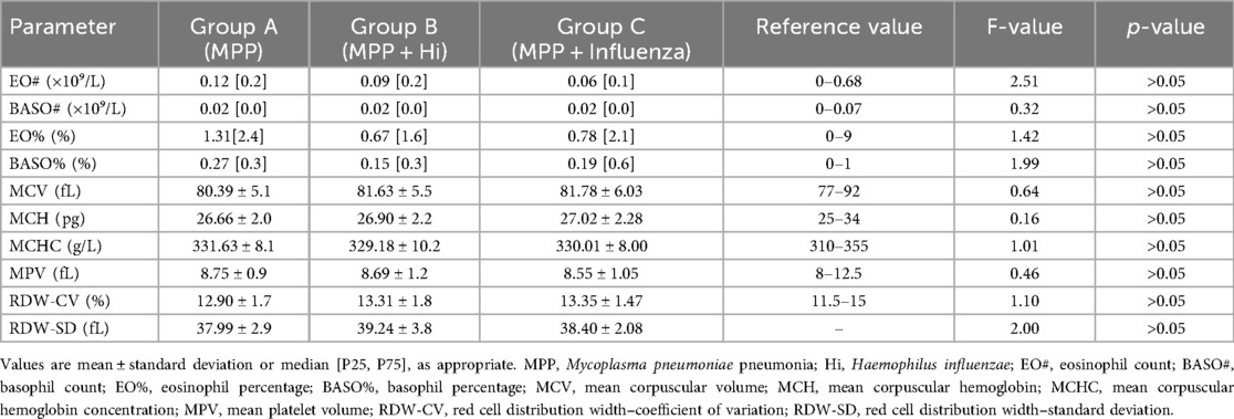 Table 3. Comparison of red blood cell indices and platelet parameters among children with Mycoplasma pneumoniae pneumonia, with and without coinfections (No significant differences in red-cell or platelet indices among groups).