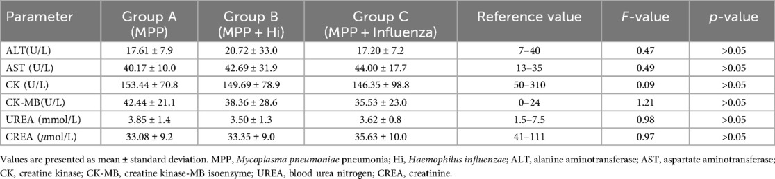 In addition, platelet counts were significantly lower in the MPP + influenza group, supporting the immunosuppressive effect of viral coinfection. Reduced platelet levels are increasingly recognized as a marker of severity in respiratory infections (24, 31). Although total WBC counts did not differ significantly between MPP and MPP + Hi groups, this may reflect sampling limitations or undetected co-pathogens (32). We also observed weak correlations among biochemical markers such as AST, ALT, CK, and CK-MB. Although these relationships were statistically significant, the effect sizes were small (r ≈ 0.3–0.4) and most likely reflect shared metabolic responses, such as concurrent hepatocellular and myocellular enzyme release, rather than clinically meaningful associations. While this overlap is expected given the enzymes’ related tissue origins, the consistent elevation of CK-MB across all groups remains noteworthy and may indicate mild, nonspecific myocardial or skeletal muscle involvement, warranting cautious clinical observation rather than a presumption of cardiac injury. Such CK-MB elevation in pneumonia may also arise from systemic inflammation, hypoxia, or skeletal muscle strain rather than direct myocardial damage, and therefore should be interpreted with caution (33–35).