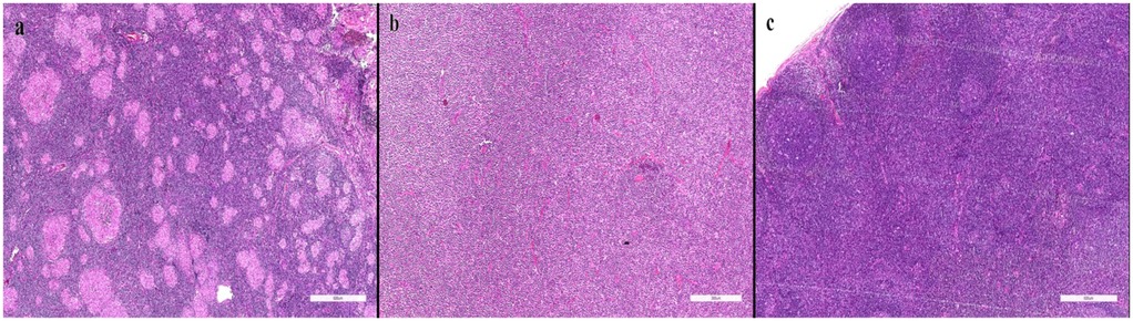 Figure 1. Representative histopathology (reactive, granulomatous, malignant). (a) Granulomatous lymphadenitis characterized by epithelioid histiocytes and multinucleated giant cells. (b) Diffuse large B-cell lymphoma demonstrating effacement of normal lymph node architecture by sheets of atypical large lymphoid cells. (c) Reactive lymphoid hyperplasia showing preserved architecture with prominent germinal centers.