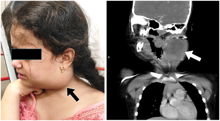 Representative clinical and radiological findings from a child with malignant lymphadenopathy. (a) Clinical photograph showing a non-tender, enlarged left cervical lymph node (arrow). (b) Contrast-enhanced neck CT demonstrating multiple enlarged nodes with central necrosis (arrow), suggestive of malignancy.