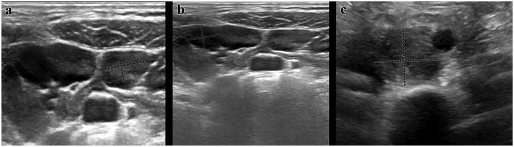 Representative ultrasonographic images of cervical lymph nodes. (a) Reactive: oval shape, preserved hilum, thin cortex, and hilar vascularity. (b) Suspicious: rounded contour, cortical thickening >3 mm, heterogeneous echotexture, and mixed vascularity. (c) Malignancy-suspected: loss of hilum, irregular margins, marked cortical thickening, and peripheral vascularity.
